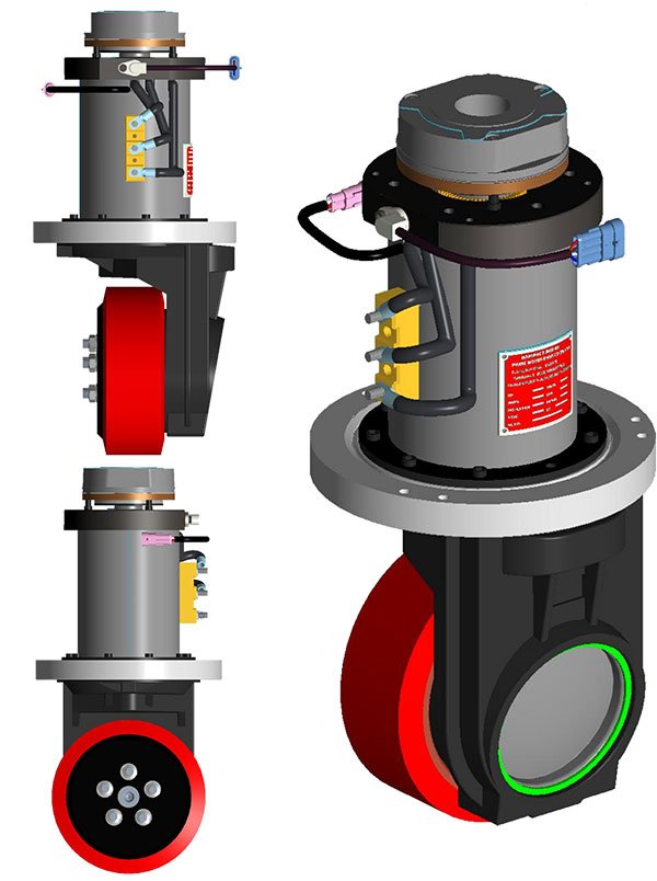 These units come with a variety of options for motors and brakes. 5-hole wheel of 230mm OD OR 215mm OD and transmission ratio of 27.8 being constant across all variations. Standard brake torque is 20Nm. However other feasible brakes can be supplied with the unit. Motors range from 1.0KW up to 2.5KW for this configuration. External dimensions remain constant across all variations. 2D and 3D drawings can be made available upon request.